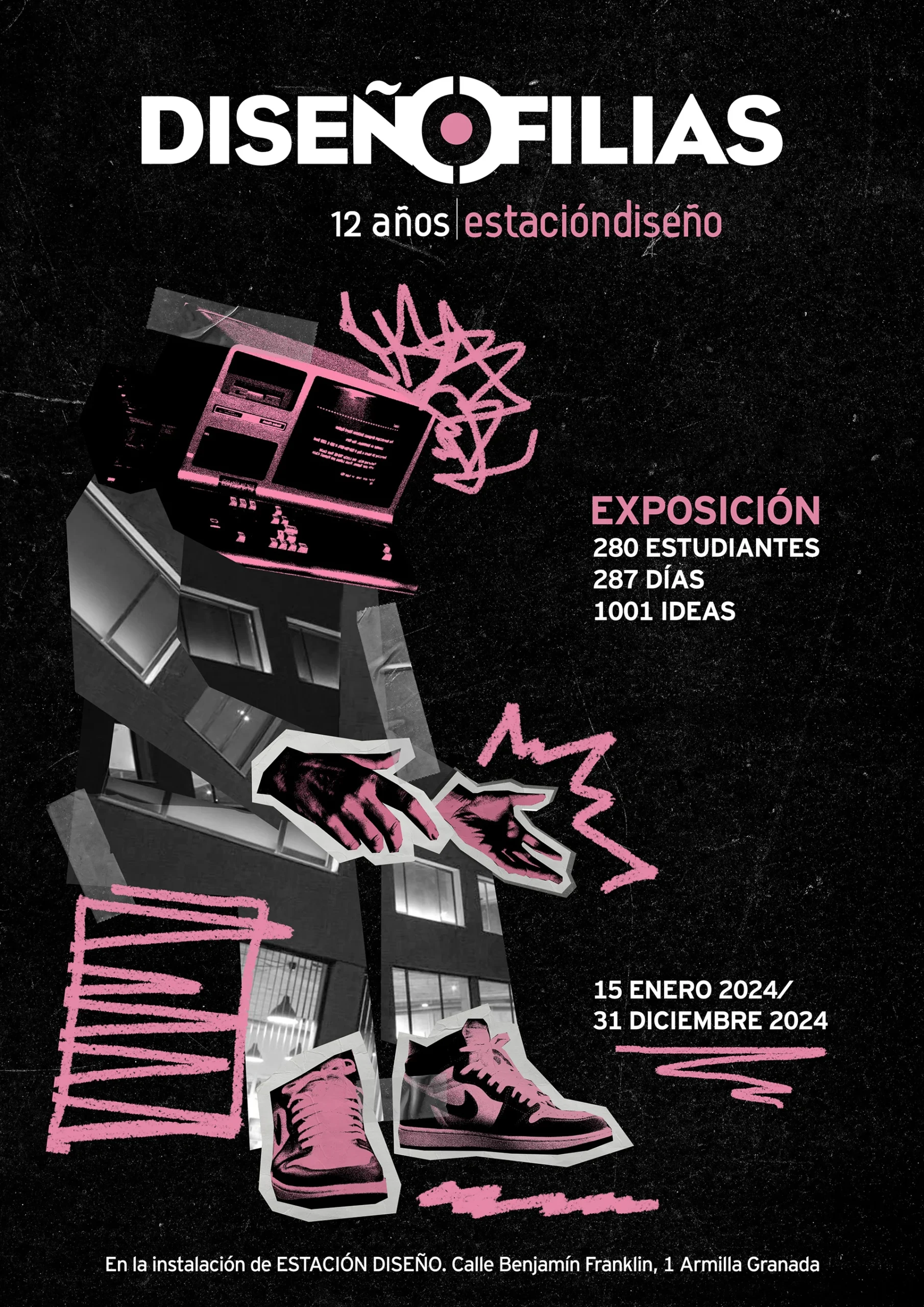 Cartel informativo inspirado en el dadaísmo para una exposición de estudiantes sobre el diseño.